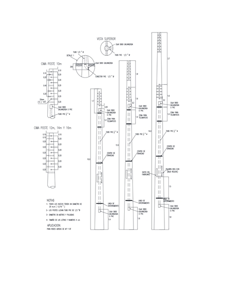 La presente especificación técnica tiene por objeto establecer las características y dimensiones que deben cumplir los postes de concreto que se emplean como soportes estructurales para alumbrado público, líneas aéreas de distribución de media y baja tensión.2. ALCANCE