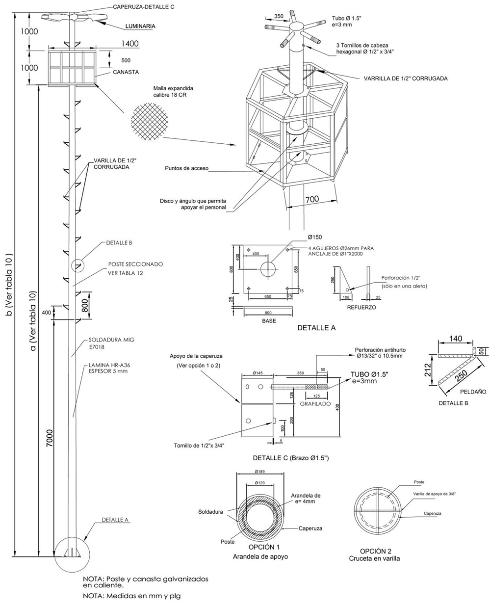 Las dimensiones de los postes y su base serán las que aparecen en las Tablas 1 y 2. Las perforaciones deben conservar su concentricidad y mantener la tolerancia adecuada con los tornillos (pernos) de anclaje.