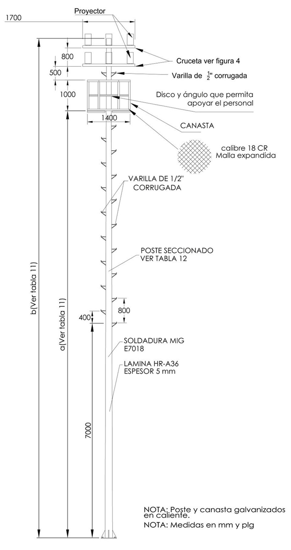 Para el caso de instalación de proyectores se deberá tener en cuenta la caperuza y cruceta especificados en las figuras No .4 y 4A. La cruceta deberá alojar 3 proyectores y se especifican hasta dos crucetas dependiendo del proyecto.