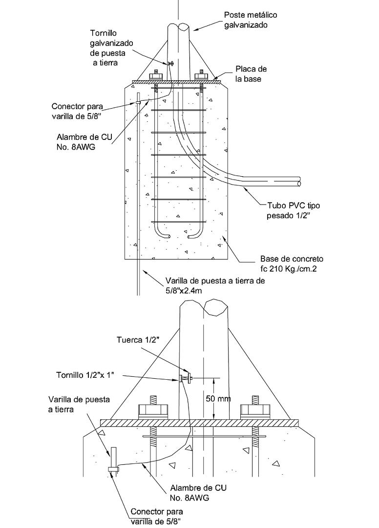 Para la conexión a tierra todos los postes deben incluir un tornillo galvanizado de ½” x 1” soldando la cabeza en la parte interna del poste a 50mm de la base y después hacer reparación de galvanizado con pintura a base de zinc y aplicar esmalte color plateado. Debe incluir una tuerca de ½” galvanizada en caliente para conexión del cable .