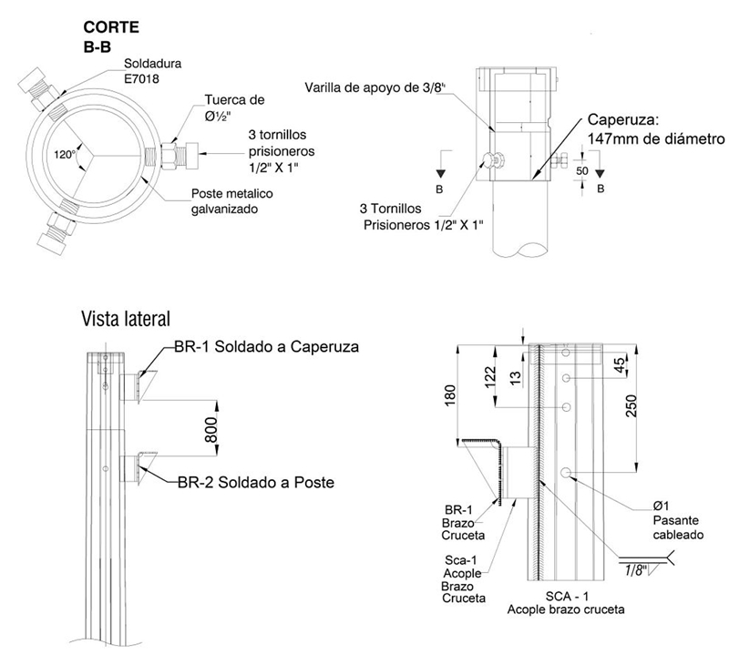 En la cima del poste se instala caperuza metálica con 4, 5 o 6 brazos para luminarias. En la figura 1 esta la opción con soportes o brazos de diámetro de 1.5” y 5 brazos y en la figura 1A se tiene la opción para soportes o brazos de 2” y 5 brazos. En la figura 1C y 1D esta el esquema para 5 y 6 brazos. En la figura 1 y No. 1B esta las caperuzas para brazos de 1.5” y 2” respectivamente.
