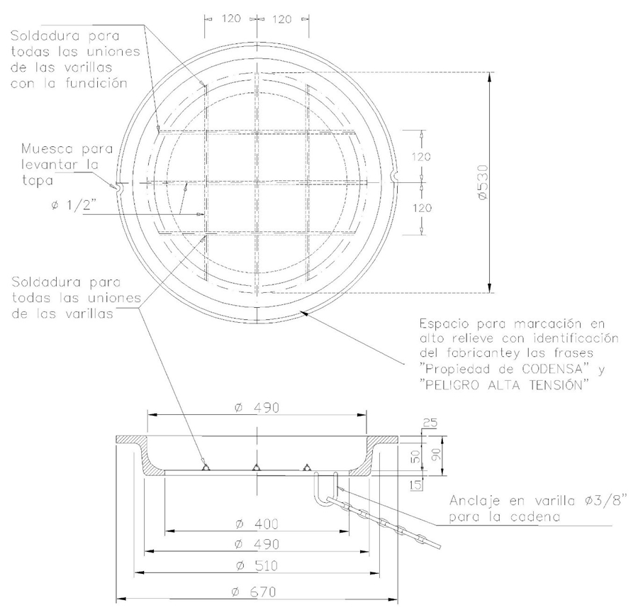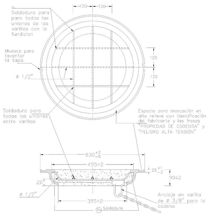 El material utilizado en la tapa será fundición de hierro nodular o fundición de hierro gris, refuerzos de varilla corrugada de acero ½” y el concreto debe ser mínimo de 4000 PSI (280 Kg/cm 2 ).