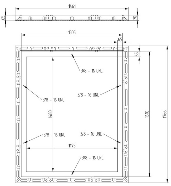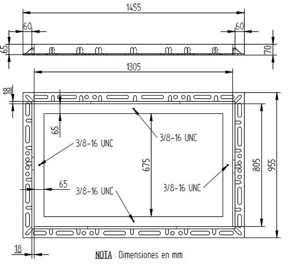 Para la fijación de la tapa al marco metálico existente se deberán hacer sobre el marco metálico perforaciones de 3/8” X 16 UNC (rosca de 16 hilos por pulgada) para poder atornillar y asegurar la tapa al marco. Para tapas de alumbrado público se requieren mínimo dos perforaciones, para tapas de MT y BT se requieren mínimo 4 perforaciones; ver figura No. 2 y figura No. 4.