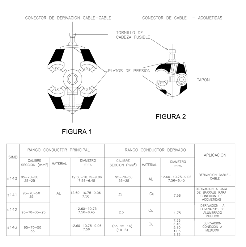 Se instalarán sobre conductores aislados con polietileno reticulado o PVC. Las piezas de conexión están formadas por una carcaza de soporte mecánico fabricada en material sintético reforzados con platos de presión externos fabricados en acero galvanizado de tal manera que garantice la presión de contacto; las carcazas sintéticas van provistas en su interior de mordazas dentadas, fabricadas en aleación de cobre estañadas (bimetálicas) o aleación de aluminio, para efectuar el contacto eléctrico perforando el aislante, según la aplicación ver tabla 1.