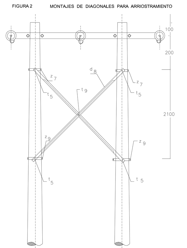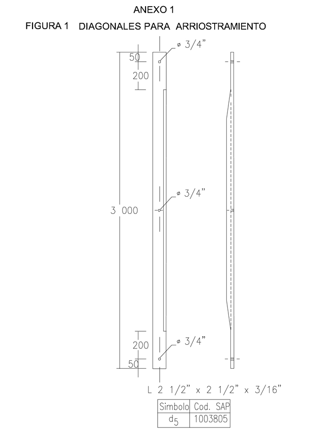 Las diagonales para arriostramiento deberán estar formadas por seis elementos, dos diagonales propiamente dichas, un tornillo de 5/8” X 1 ½”, una arandela plana, una arandela de presión y una tuerca de 5/8”; todos los materiales de las diagonales deben ser de alta calidad y cumplir la norma NTC – 422; el acero debe ser de bajo silicio o sea menor de 0,05% (A34 - SAE1010 ó SAE 1020.