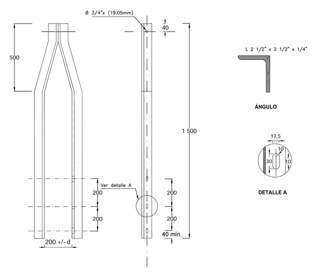 Las bayonetas para retención deberán estar formadas por dos elementos, en ángulo de 2 1/2 ” X 2 1/2 ” X ¼”; todos los materiales deben ser de alta calidad y cumplir la norma NTC 422; el acero debe ser de bajo silicio o sea menor de 0,05% (ASTM A34 - SAE1010 ó SAE1020).6.1 GEOMÉTRICOS.