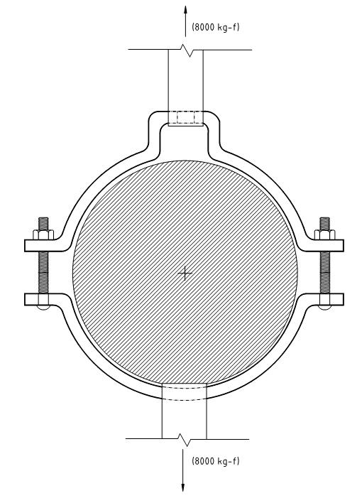 8.1.3.1 Ensayo de tracción y de flexiónLas abrazaderas deben poder soportar una carga mínima de 6.000 kg-f según el montaje de ensayos mostrados en la figura 2 sin que se presenten agrietamientos o roturas. Mantener la carga por un minuto. Llevar a carga de rotura con un valor mínimo de 8.000 kg-f.