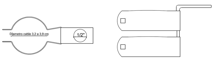 Los elementos de sujeción de cable MT monopolar a cruceta, deben cumplir las dimensiones y perforaciones dadas en las figuras a continuación, medidas dadas en mm.