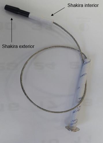 Así mismo se deben fijar o ponchar dos shakiras en el extremo del cable del fusible de la siguiente manera; la shakira del lado exterior donde termina el cable representa el tipo de fusible es decir si es K o T, y la shakira al lado interno que corresponde al lado del tubo corresponde al nivel de corriente. En la siguiente figura se ilustra un ejemplo de la instalación de estos aditamentos que corresponde a un fusible tipo T de 10 A en 11.4 kV