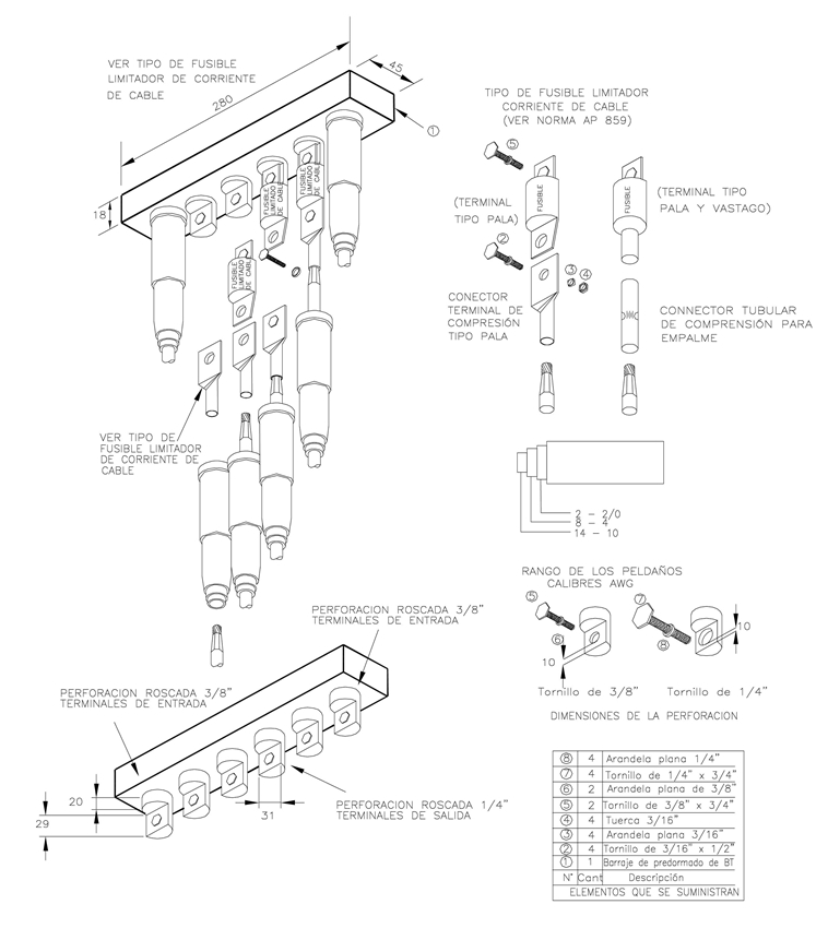 Los fusibles serán instalados en barrajes preformados de baja tensión para fusibles limitadores de cable según CS340 y AP 820 , de acuerdo con el anexo 1