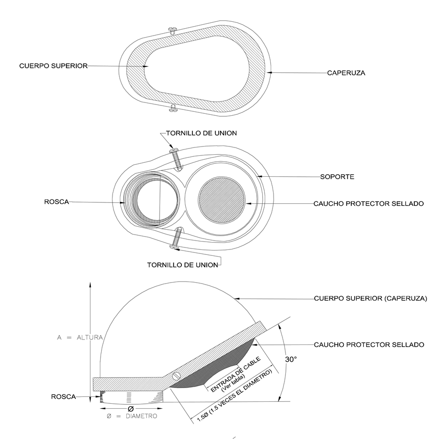 El método de fabricación puede ser: fundición, forjado, inyectado o cualquier otro método de aplicación técnica siempre que cumpla los requisitos técnicos de esta especificación.El capacete se conforma de dos cuerpos; el cuerpo superior que se denomina caperuza y la parte inferior que posee un soporte con rosca para tubo galvanizado IMC, dos tornillos de unión y un caucho protector que evita la entrada de agua.