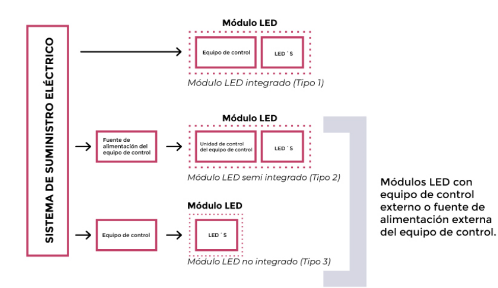 • Módulo LED: Fuente de luz LED que no tiene casquillo, que incorpora uno o más encapsulados LED en un circuito impreso y la posibilidad de incluir uno o más de los siguientes elementos: componentes eléctricos, ópticos, mecánicos y térmicos, interfaces y equipos de control. Un módulo LED puede ser integrado (módulo LEDi, tipo 1), semi integrado (módulo LEDsi, Tipo 2) o no integrado (módulo LEDni, Tipo 3). El módulo LED está normalmente diseñado para formar parte de una bombilla LED o una luminaria LED.