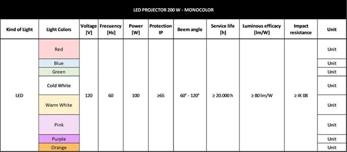 - Proyector LED 200W - IP 65 – MONOCOLOR