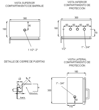 La base de la caja debe poseer dos petroquelados; uno de ellos para diámetros de tubos metálicos galvanizados de 1 ½“, y 2” y la perforación restante de un diámetro de 2” con el fin de comunicar el compartimento de barrajes con la base para medidores. (ver figuras 1 y 2)