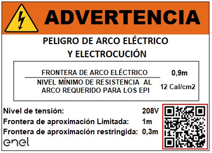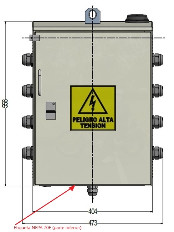 Adicionalmente debe incluir una etiqueta en la parte inferior de 11 x 16 cm en letras negras y fondo amarillo, según modelo indicado como etiqueta NFPA 70E, en tinta indeleble y resistente a los rayos UV.