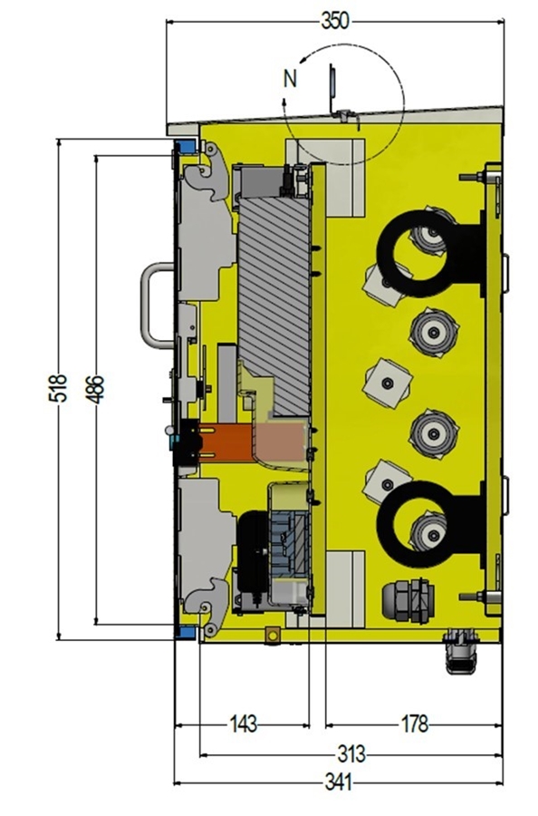 14Orificio parte inferior celda---Dos (2) orificios para instalación de prensa estopa tipo PG21. Un 1 orificio libre y 4 con tapón metálico asegurado desde el interior
