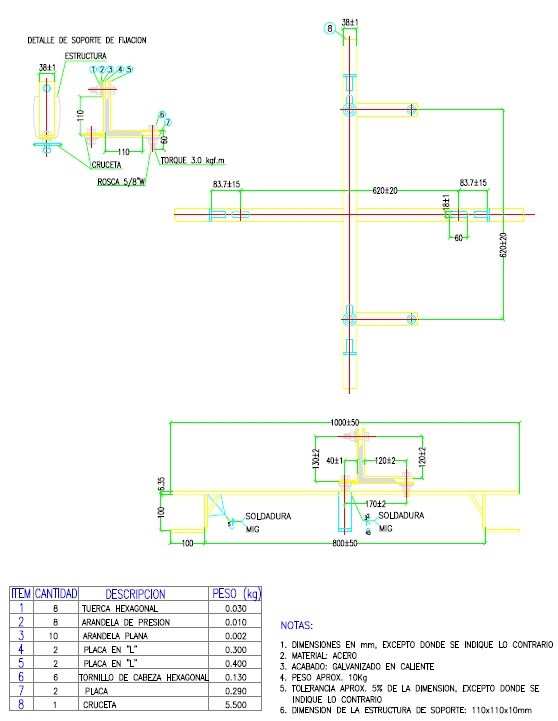 Para facilitar el mantenimiento , las fijaciones no deben realizarse con pernos, tuercas, golillas (arandelas), exigiéndose el uso de pasadores con chavetas de seguridad de acero galvanizado.