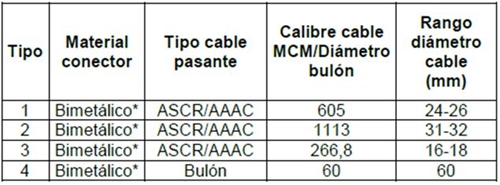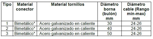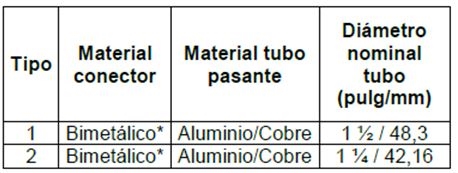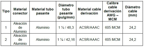 La cantidad y diámetro de los pasadores de fijación de conductores para conectores están indicados en la tabla del Anexo 1, para diferentes calibres de conductores y diámetros de tubos y bornas.
