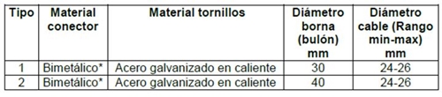 - Las aleaciones usadas deben ser lo suficientemente fuertes para soportar la presión de los tornillos y lo suficientemente dúctiles para ejercer una acción envolvente sobre el conductor de manera que se obtenga una eficiente transferencia de corriente.
