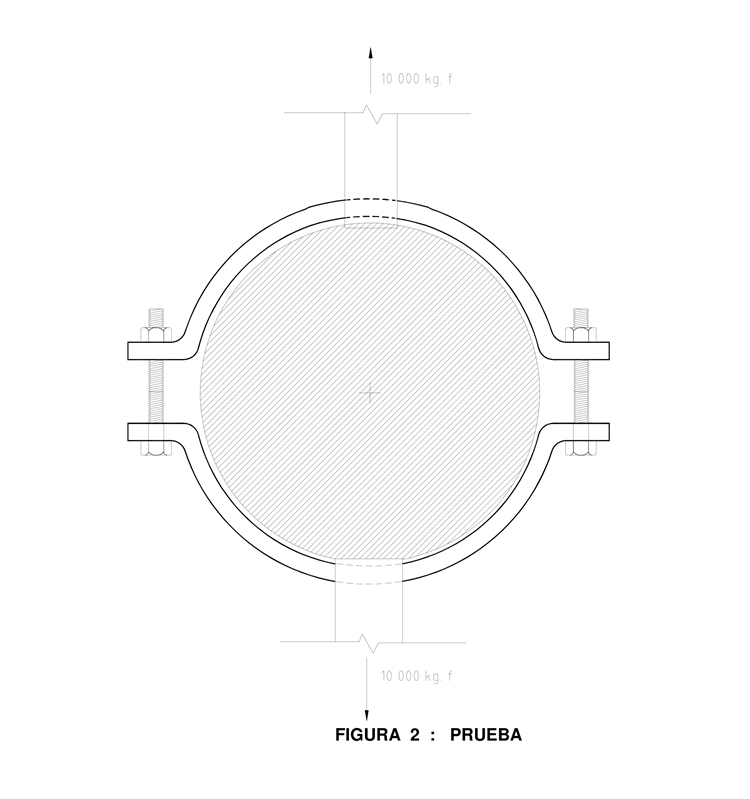 Las abrazaderas deben poder soportar una carga mínima de 10.000 kg-f según el montaje de ensayos mostrados en la figura 2 sin que se presenten agrietamientos o roturas. Mantener la carga por un minuto. Llevar a carga de rotura con un valor mínimo de 14.000 kg-f.