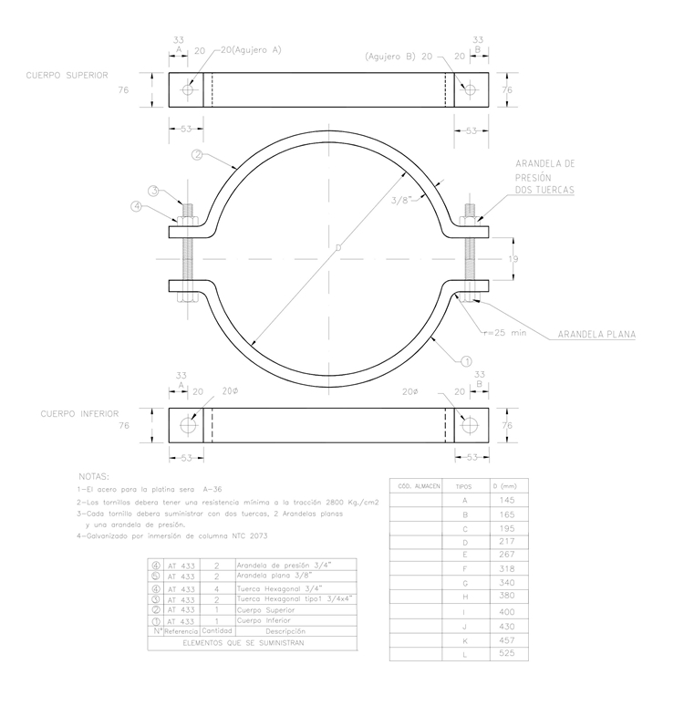 Las platinas se galvanizan con clase B-2 y los elementos roscados con clase C según Norma NTC 2076 (tabla 3).