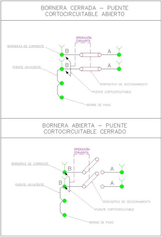 Las borneras de corriente poseen la función de seccionamiento y cortocircuito de forma simultánea, lo cual se logra mediante un mecanismo que asegure que nunca quedará una corriente abierta mientras se realiza el seccionamiento, y una vez abierto el borne completamente, la corriente seguirá su camino por el lado de la conexión, dejando libre al equipo conectado por el otro lado del borne .