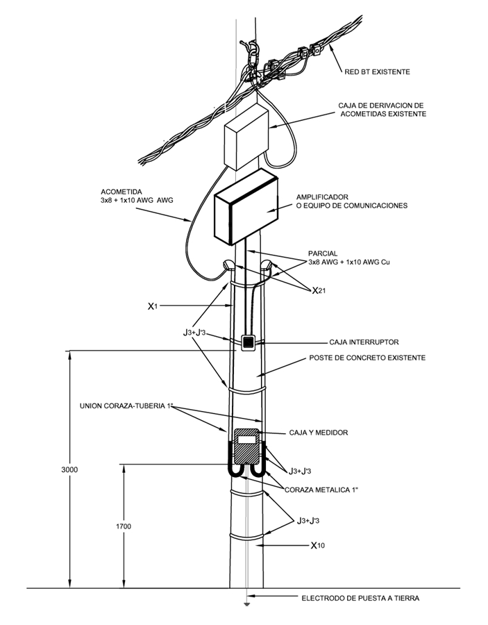 2. Si no existe caja de derivación de acometidas, la alimentación del medidor se realizará desde la red de baja tensión con conectores de perforación 4/0-6 AWG.