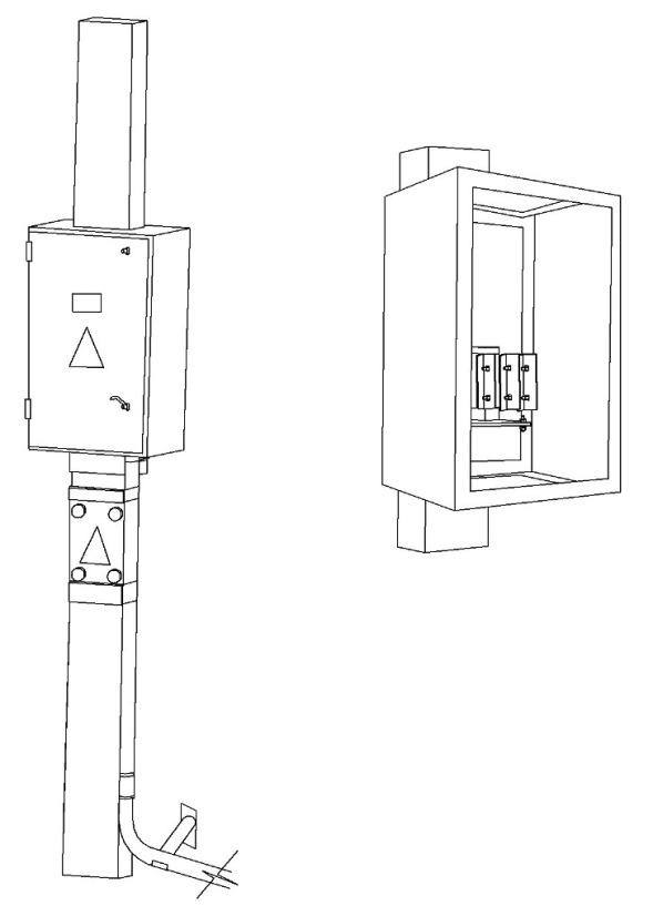 Al pie del poste de alimentación deberá existir una caja de inspección para acometida de B.T. a una distancia <= 1,5 m. (Norma AE 238 ). En los casos donde el poste queda en el mismo costado del predio y la distancia hasta el equipo de medida es igual o inferior a 3 metros, la alimentación se puede realizar sin utilizar la caja de inspección.