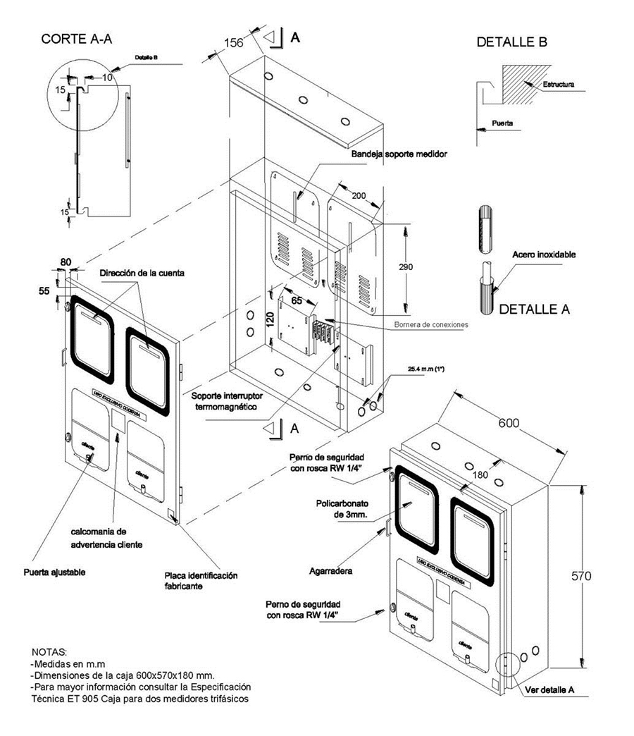 En la parte superior, la caja para medidor posee una ventana de inspección con un marco (145x 120 mm), y una transparencia de seguridad de 3 mm de espesor (125 mm x 100 mm), en la parte inferior posee una tapa deslizable para maniobrar el interruptor , sin riesgo de tocar partes energizadas y evitar el ingreso de agua. Tendrá un orificio para el buje de cerradura de 16 mm con perno RW ¼” y una perforación que permita la instalación de un sello de seguridad de la compañía. La localización del centro del buje triangular debe ser concéntrica con la rosca que lo recibe.