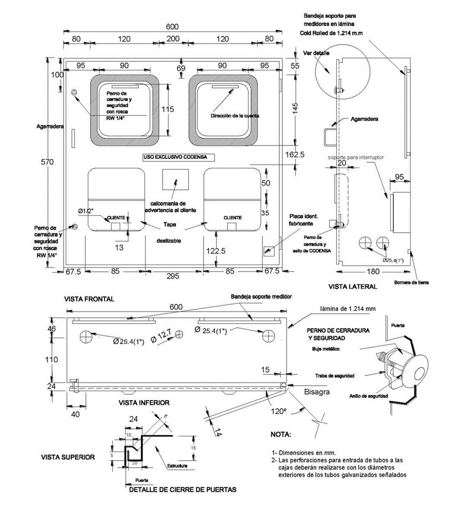 En la base la caja para medidor, deberá tener perforaciones (pretroqueladas que permitan fácilmente removerse en la instalación) para ductos de 1” de diámetro. Tres en la parte superior para la entrada de las acometidas, y dos en cada cara lateral para la salida a la caja ó tablero de distribución del usuario y dos en la parte inferior para la salida y además otra de ½” para puesta a tierra .