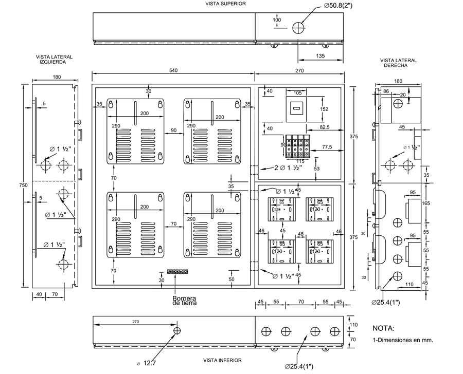 AE306 Cajas para tres y cuatro medidores monofasicos, bifasicos o trifasicos. Especificaciones generales