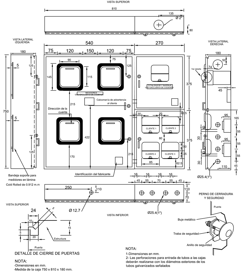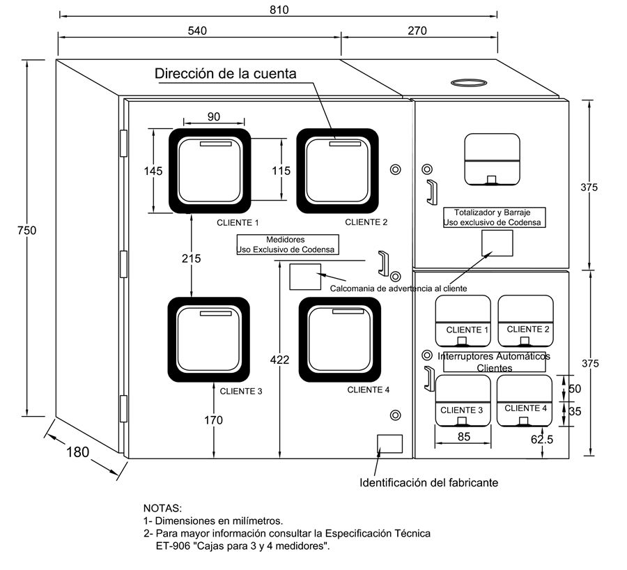 Debajo de la ventana de inspección de los interruptores así como en el compartimento de los medidores otra que diga “CLIENTE 1, 2, 3 ó 4” según corresponda.