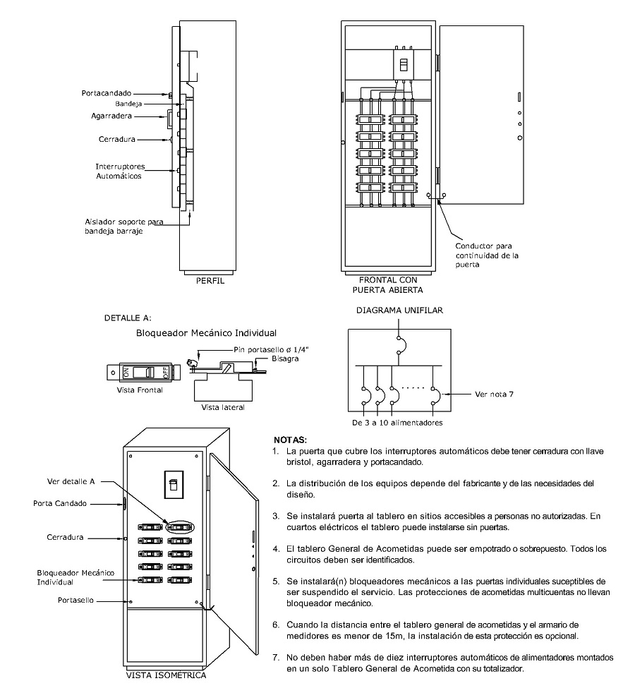 La colocación de los interruptores para las acometidas parciales a armarios o cajas de medidores, dependerá de la distancia entre el tablero de acometidas y el armario de medidores. Si esta distancia es superior a 15 m deben instalarse los interruptores, si es menor, la instalación de los mismos será opcional. Las paredes laterales, del fondo, superior y las puertas deben ser construidas en lámina de acero tipo Cold Rolled de calibre BWG 16 (1,588 mm) como mínimo. El calibre de la lámina deberá aumentarse dependiendo del nivel de corto circuito al cual sea sometido el gabinete.