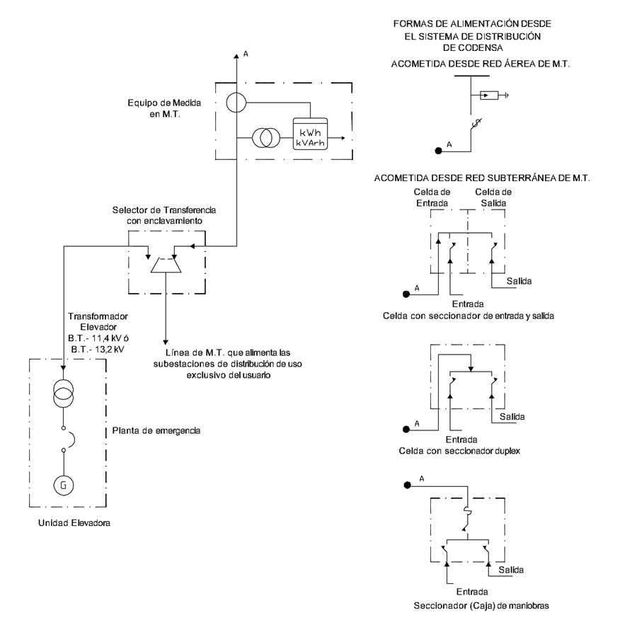 - Este díagrama unifilar de instalación de plantas de emergencia en M.T. solo se permite en el caso de que el usuario tenga una red de M.T. de uso exclusivo dentro de sus predios con equipo de M.T. a la entrada del mismo.