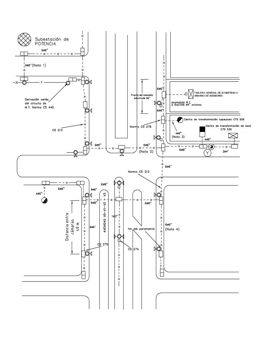 2. En los cruces de vías arterias Vo, V1, V2 y V3 se utilizarán bancos ductos de 9ø6”. Se instalarán los cruces como mínimo cada 500 m. Otros cruces de vías locales en 6ø6”.