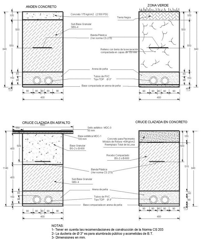 AP207 Detalles ductos, zanjas y rellenos. 2 ductos diámetro Ø 3”