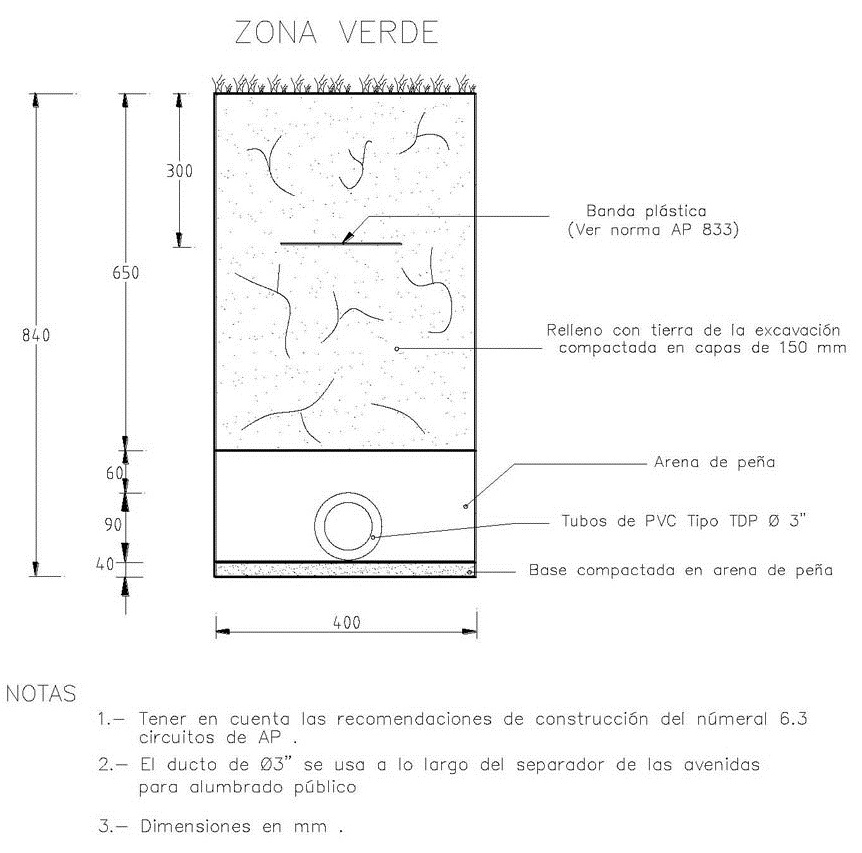 AP220 Detalles ductos, zanjas y rellenos. 1 ducto diámetro Ø3”