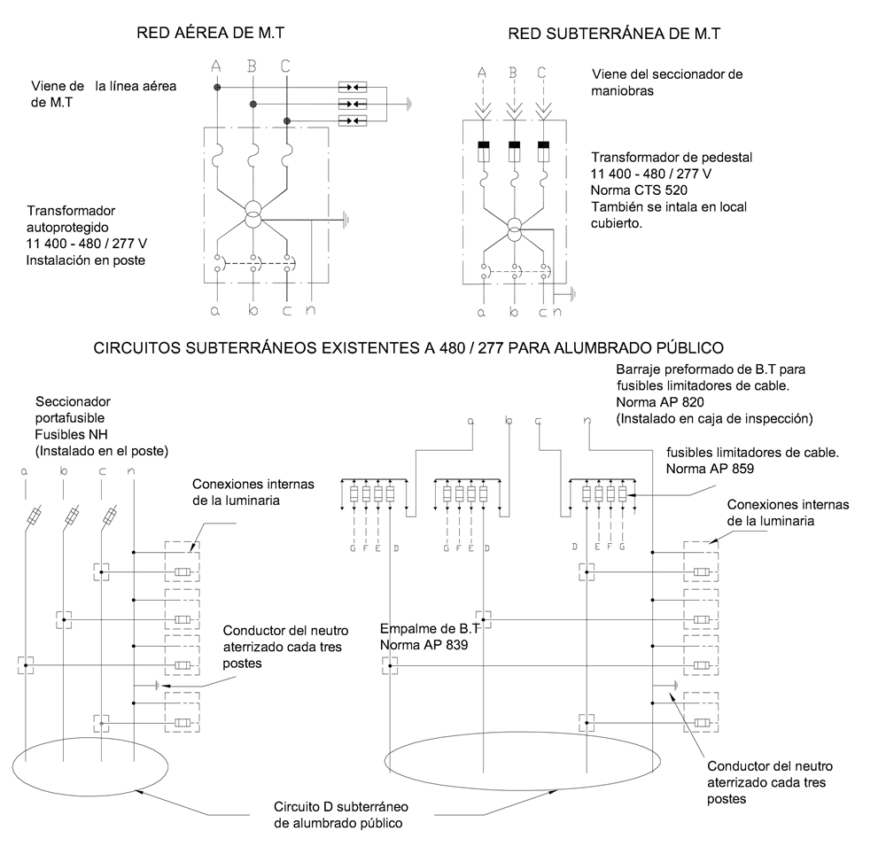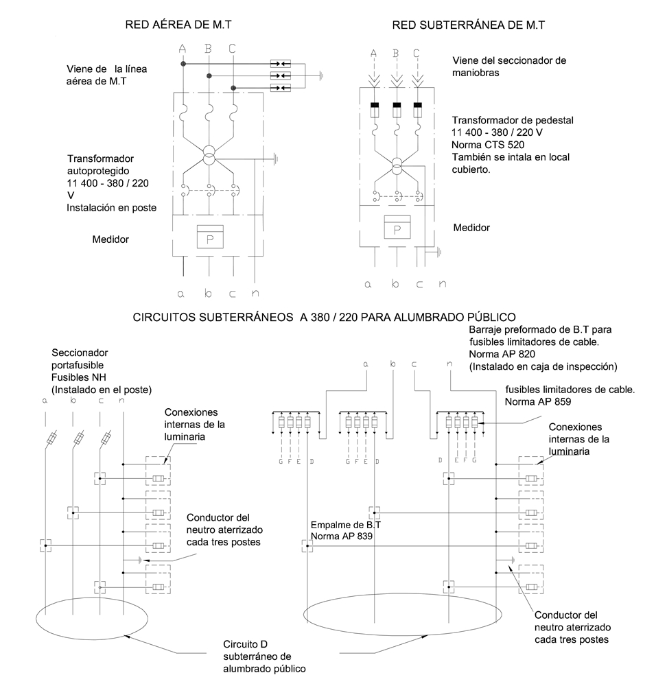AP172 Diagrama de un circuito subterráneo de alumbrado público de vías arterias V0-V1-V2-V3 tensión 380/220 V y 480/277 V