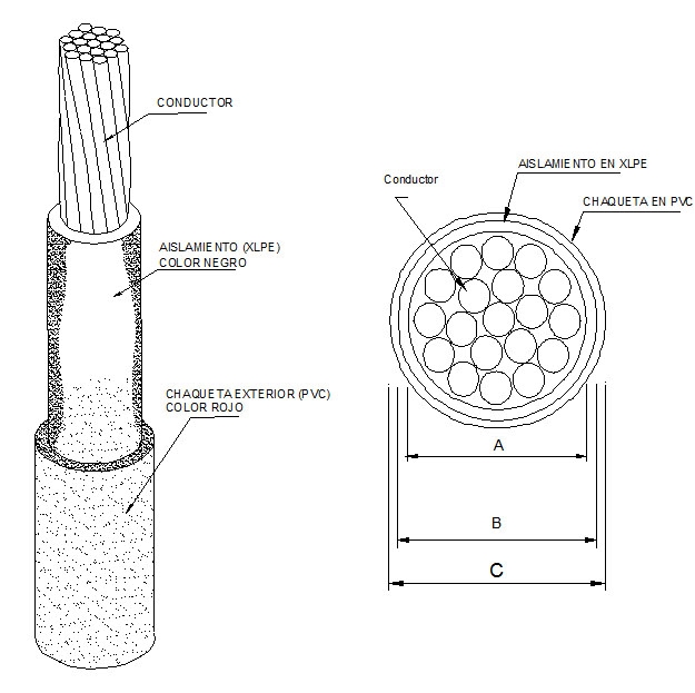 La chaqueta para el recubrimiento del aislamiento del conductor debe ser de Policloruro de Vinilo, PVC, de color rojo.El aislamiento del conductor debe ser de Polietileno reticulado de cadena cruzada, XLPE, de color negro, adecuado para uso en medios húmedos y resistente a los esfuerzos mecánicos durante la instalación y operación del cable .