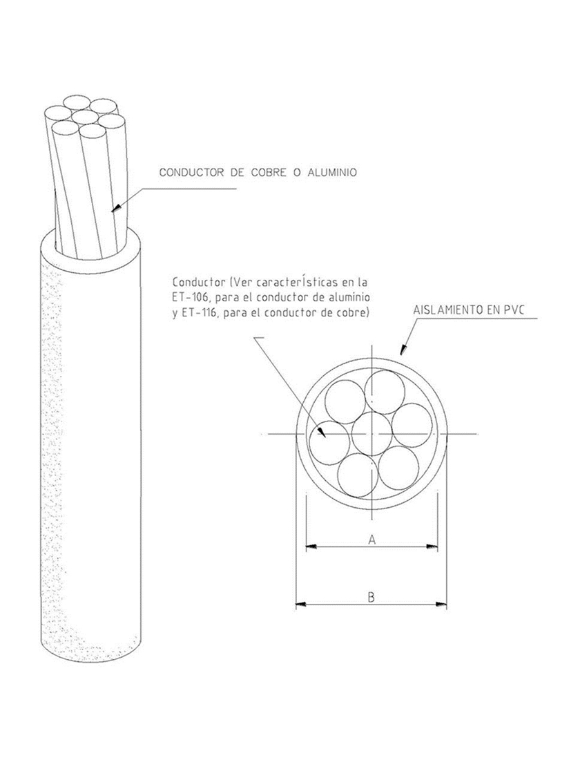 | Calibre AWG | Sección Cond. Desnudo mm 2 | Sección Total Cond. mm 2 | Diámetro Cond. Desnudo (A) (mm) | Espesor Aislamiento (mm) | Diámetro Ext. Conductor (B) (mm) |