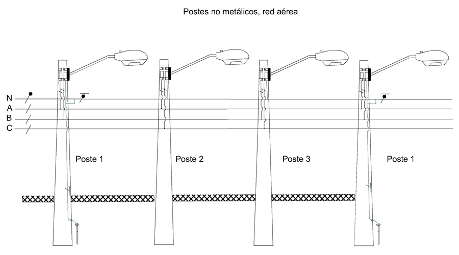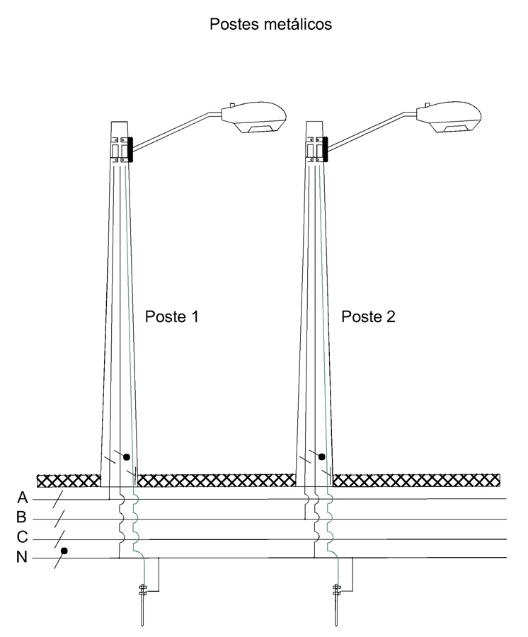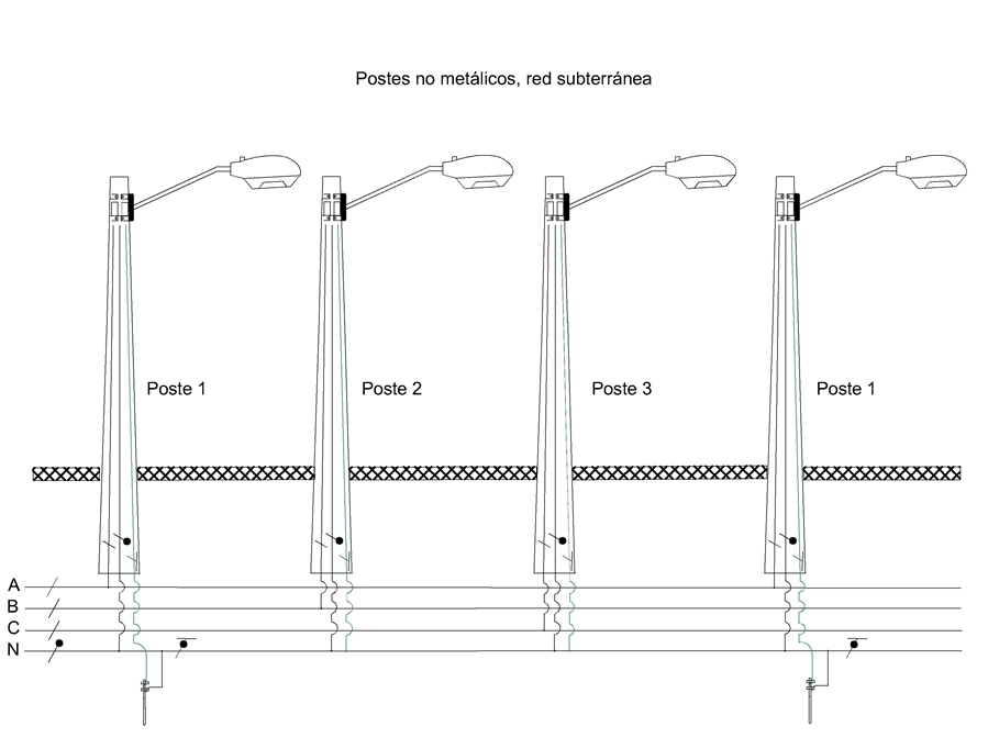 En el segundo y tercer poste, del circuito de neutro salen dos hilos independientes uno para neutro y otro para tierra. Llegan del piso a la luminaria 3 hilos (FASE-NEUTRO –TIERRA). Todos los finales de circuitos deben ir aterrizados