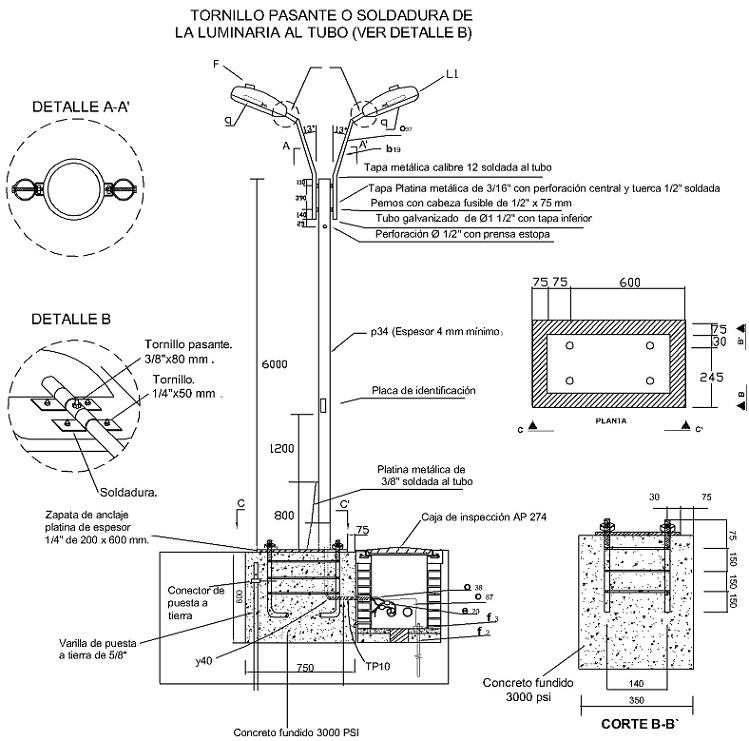 -En zonas verdes el pedestal debe sobresalir 100 mm del poste para evitar oxidaciones.