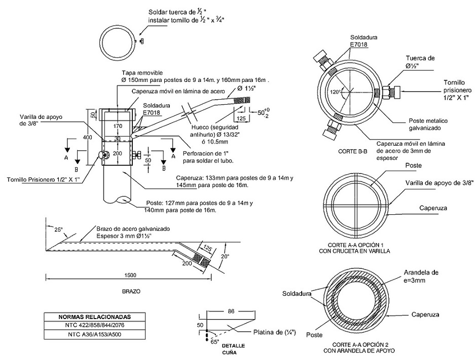 En la caperuza las varillas de 3/8” se utilizan para el apoyo en el poste y su vez para facilitar el alambrado interno del mismo