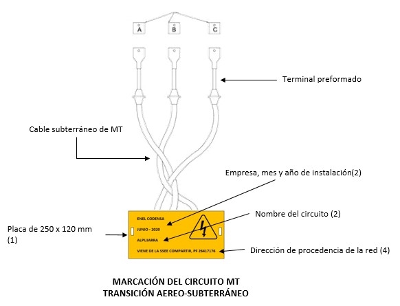 4. En La placa de marcación del circuito MT en transiciones aéreo-subterráneo, se debe indicar la dirección de procedencia de la red y una referencia eléctrica.