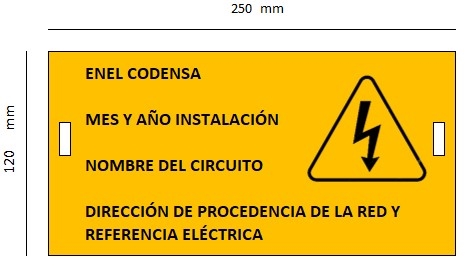 1. La placa debe ser elaborada en baquelita, acrílico o cualquier otro elemento que resista la humedad, oxidación y rayos UV. (ENEL-Enel Colombia exigirá al fabricante las pruebas de envejecimiento para garantizar lo solicitado.