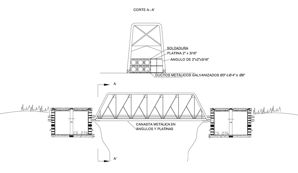 Para cruces sobre canales o vacíos, se instalarán los ductos metálicos galvanizados sobre estructura metálica de apoyo, instaladas en canastas metálicas en ángulo y platinas debidamente soldadas.