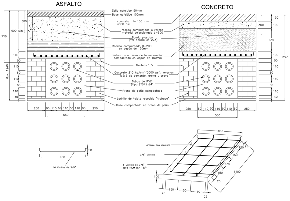 CS221 Cruce de vías. Detalles ductos, zanjas y rellenos, 9 ductos diámetro Ø4”