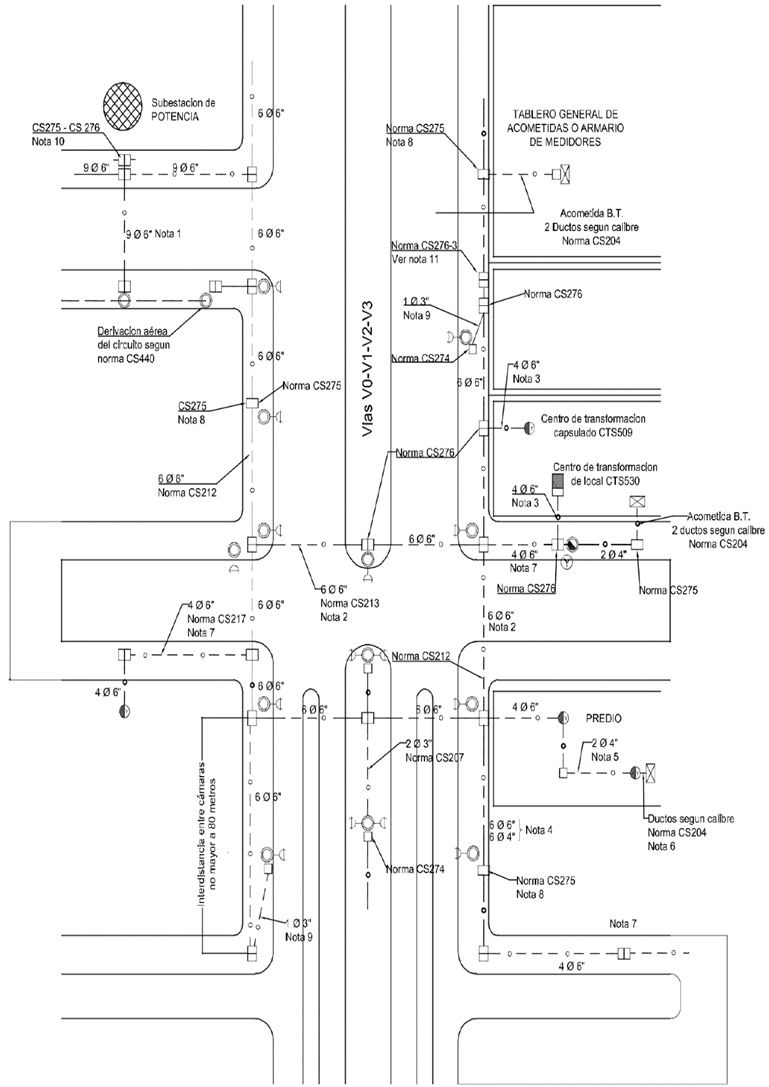 8. En la ruta determinada del banco de ductos de hasta 6Ø6", se permitirá construir caja de inspección sencilla CS275 en sentido transversal; para derivaciones de acometidas de BT y AP y como cajas de paso. En caso de derivaciones futuras por expansión de la red de MT se debe ampliar a cajas de inspección dobles CS276 .
