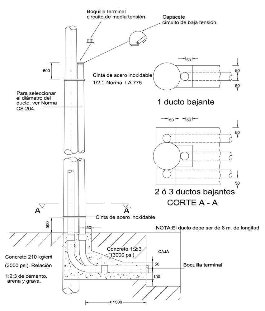 1. En casos estrictamente necesarios se permite el uso de dos ductos destinados a la red de MT y tres ductos para poste