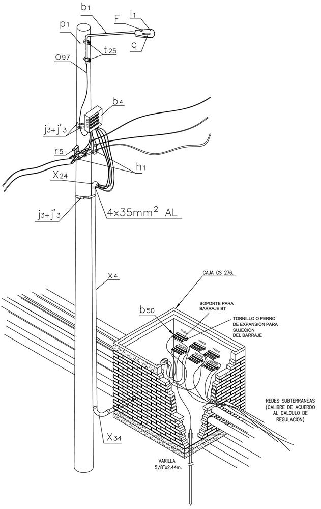 (4) La alimentación de la caja de derivación se realiza máximo en 35mm² por limitaciones en el diámetro del conductor permitido. Con este conductor se acepta derivar como máximo 9 acometidas monofásicas o 4 trifásicas, si se tienen en un poste más acometidas se debe instalar una bajante y una caja de derivación de acometidas adicionales.